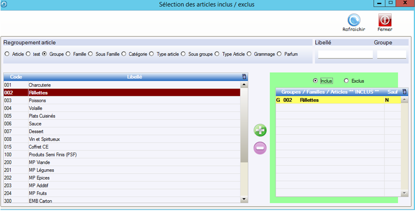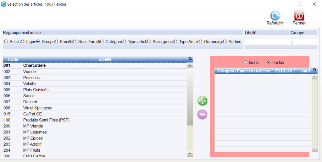Rq : On ne peut pas en même inclure des articles et exclure des familles, ni exclure des articles et inclure des familles.