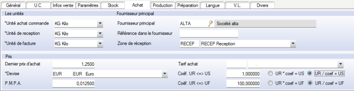 Le terme prix d’achat désigne le PMPA (Prix Moyen Pondéré d’Achat) avec pour valeur par défaut le « dernier prix d’achat article ».