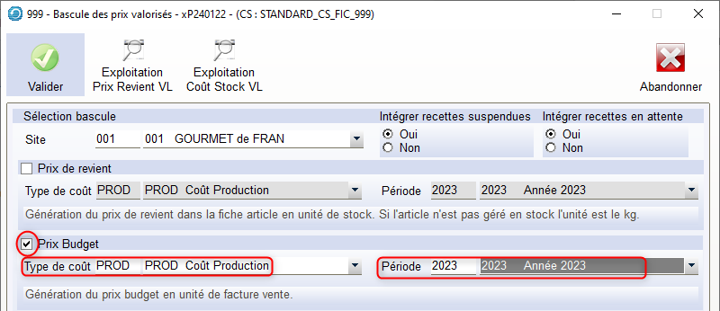 Prix budget saisi dans la fiche article ou calculé via les recettes valorisées