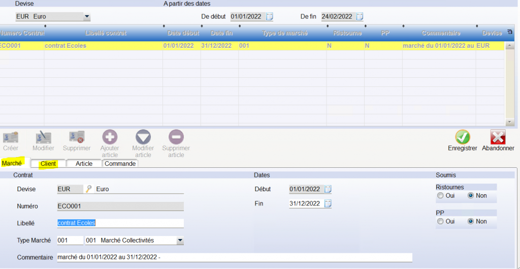 Cette fonction permet d’enregistrer des conditions tarifaires dans le cadre d’un marché (par ex écoles , collectivités).