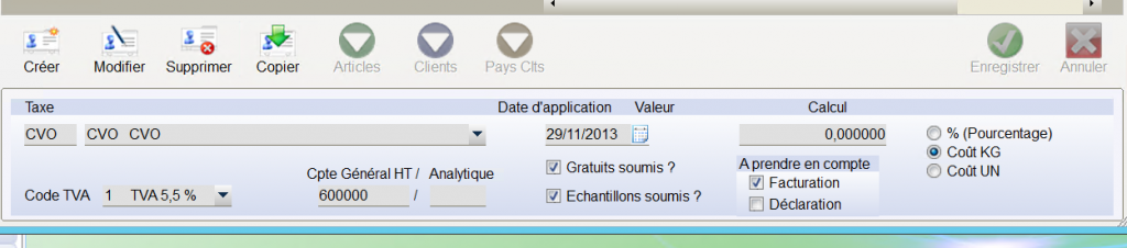 L’utilisation du Bouton Copier représente un gain de temps certain pour dupliquer des Taxes se ressemblant en terme de paramétrage et d’affection Article/Client/Pays…