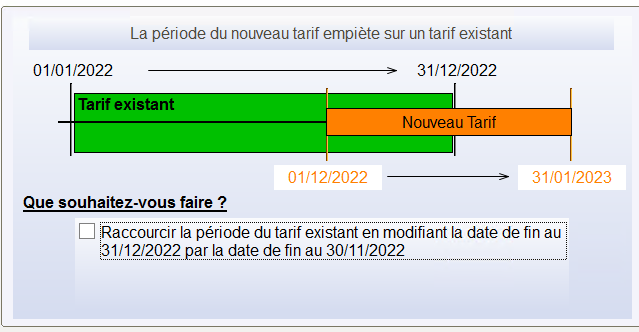 A l’enregistrement de la condition tarifaire , si le logiciel détecte un chevauchement de date , il propose des choix de report automatiques