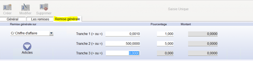 Via le bouton « articles » , ce filtre d’articles concerne l’application de la remise , mais n’influe pas sur la base de calcul des tranches d’application, c’est systématiquement le total de tous les articles qui est pris en compte.