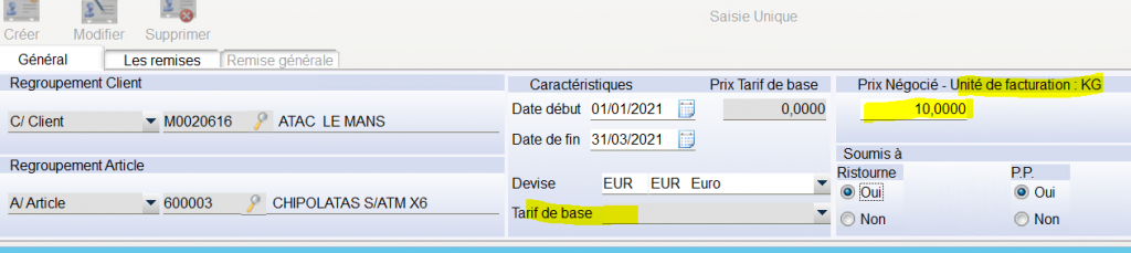 Il n y a pas de possibilité de prix négocié pour un article pour tous les clients , par ex on ne peut pas appliquer une remise sur « tous les jambons » et tous clients. Il faut dupliquer les paramétrages par des regroupements « tarif de base » ou « regroupement tarifs clients ».
