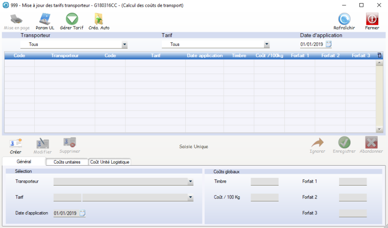 La saisie des tarifs transport