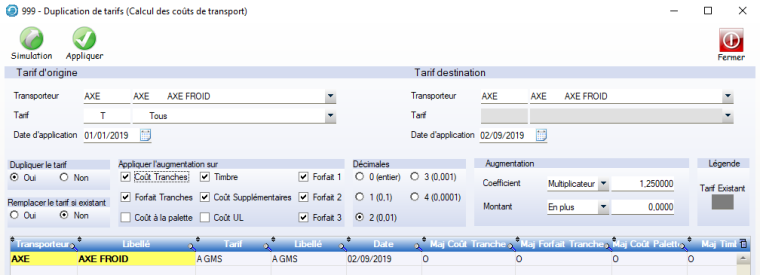 • Cliquer sur le bouton Simulation pour contrôler si les tarifs existent ou non.