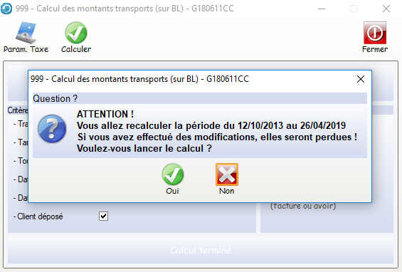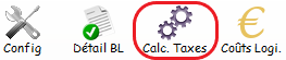 • Le bouton Calc. Taxes permet de calculer les taxes qui n’ont pas été paramétrées par l’écran de calcul ou de les calculer après coup car le montant au moment du calcul était inconnu.