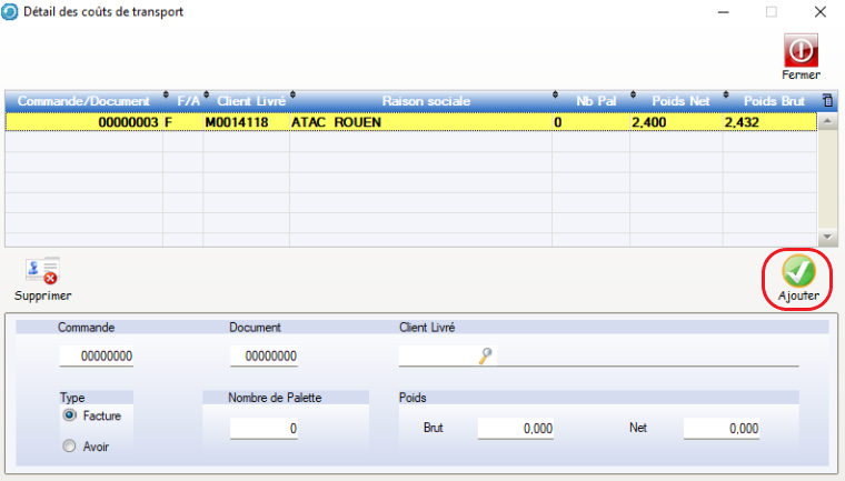 • Cliquer sur le bouton Ajouter, de nouvelles lignes peuvent également être ajouter, par exemple en cas de prestations de transport ne correspondant pas à des BL.