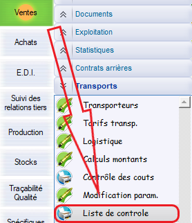 Le chemin d’accès : Ventes > Transports > Liste de contrôle