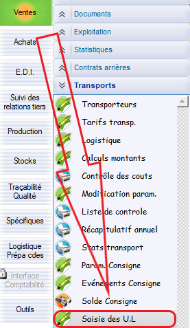 Le chemin d’accès : Ventes > Transport > Saisie des U.L