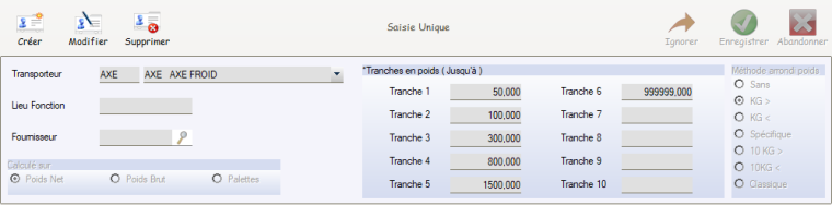• Permet de saisir les conditions tarifaires qui dépendent des seuils de poids :