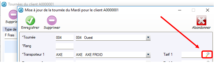 • Dans la fenêtre de Mise à jour de la tournée, cliquer sur la loupe associée à un champ Tarif.