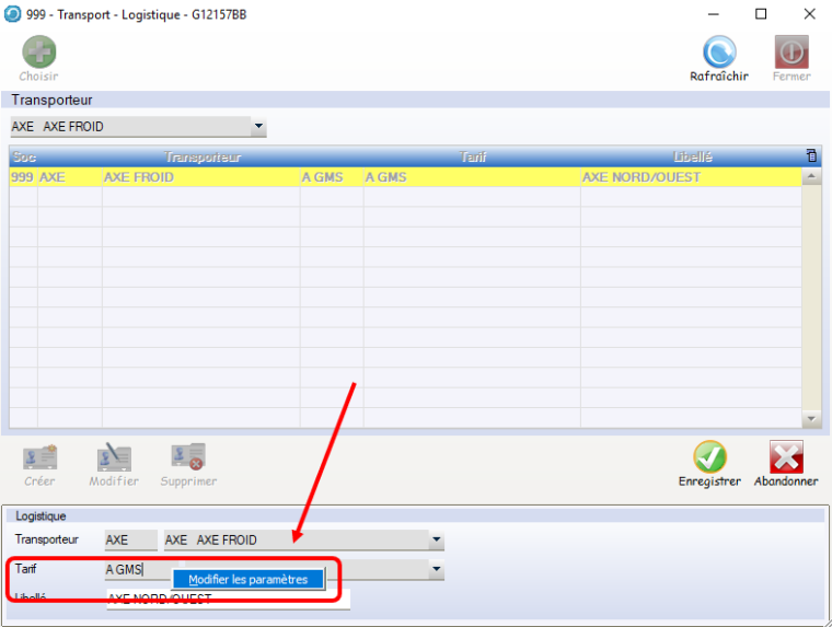 • A l’ouverture de la fenêtre Transport – Logistique, cliquer droit dans la case Tarif, puis Modifier les paramètres